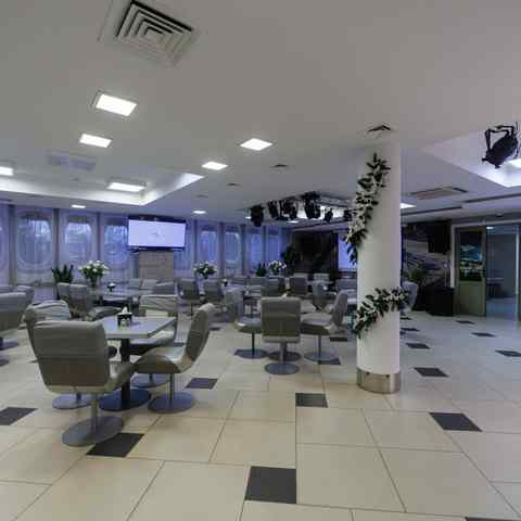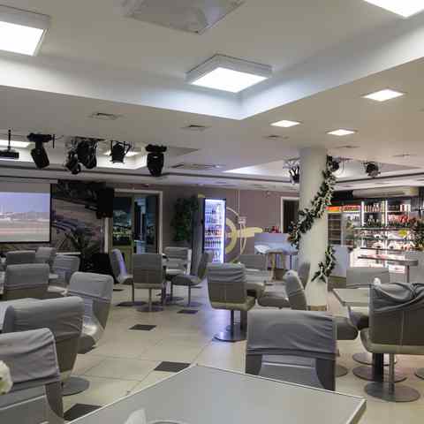 Интерьер кафе выполнен в авиационной тематике: пространство оформлено так, чтобы напоминать салон самолёта. Внешне окна стилизованы под иллюминаторы, а столы и посадочные места расположены так, будто вы на борту воздушного судна — с элементами, создающими ощущение полёта. Светлые стены, просторный зал и стильные кожаные кресла формируют атмосферу комфорта и лёгкости, где можно не только насладиться едой, но и провести время в необычной обстановке, вдохновлённой авиацией.