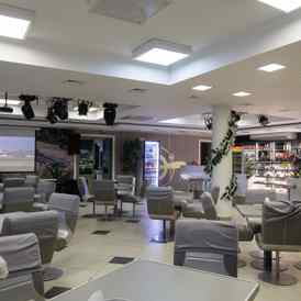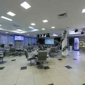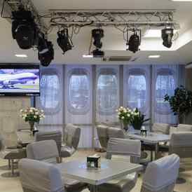 Интерьер кафе выполнен в авиационной тематике: пространство оформлено так, чтобы напоминать салон самолёта. Внешне окна стилизованы под иллюминаторы, а столы и посадочные места расположены так, будто вы на борту воздушного судна — с элементами, создающими ощущение полёта. Светлые стены, просторный зал и стильные кожаные кресла формируют атмосферу комфорта и лёгкости, где можно не только насладиться едой, но и провести время в необычной обстановке, вдохновлённой авиацией.